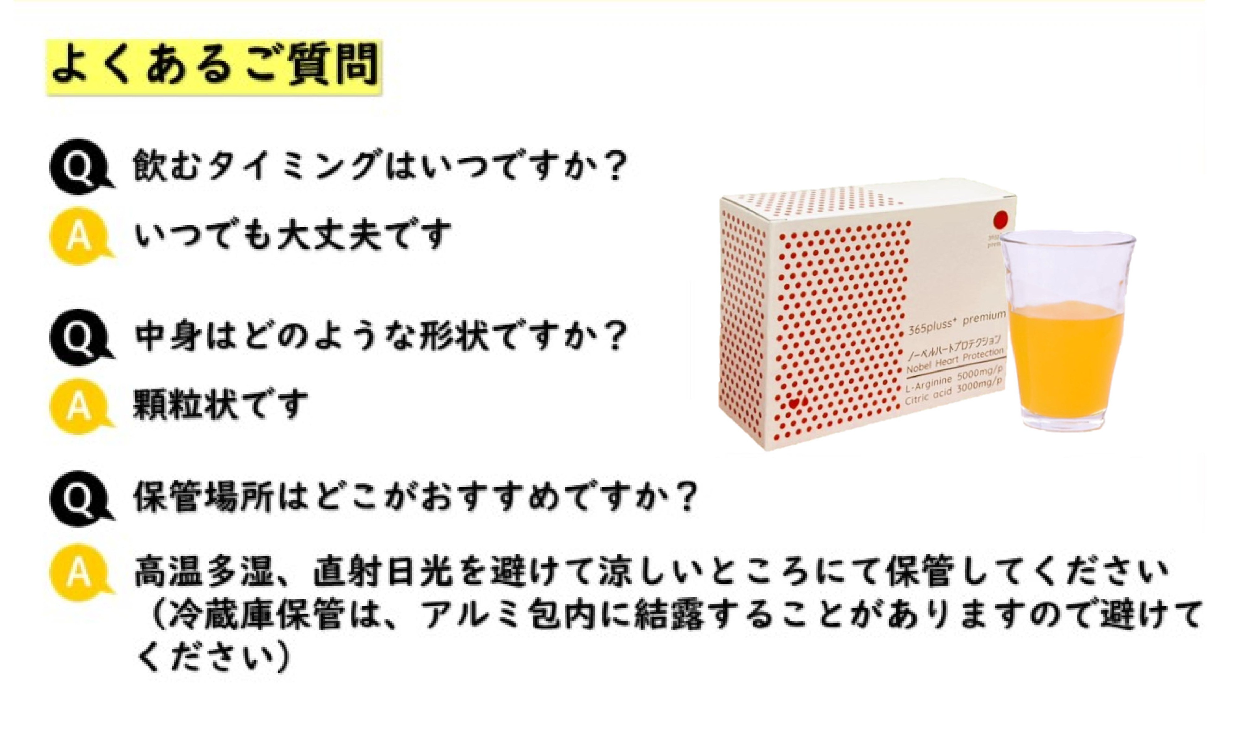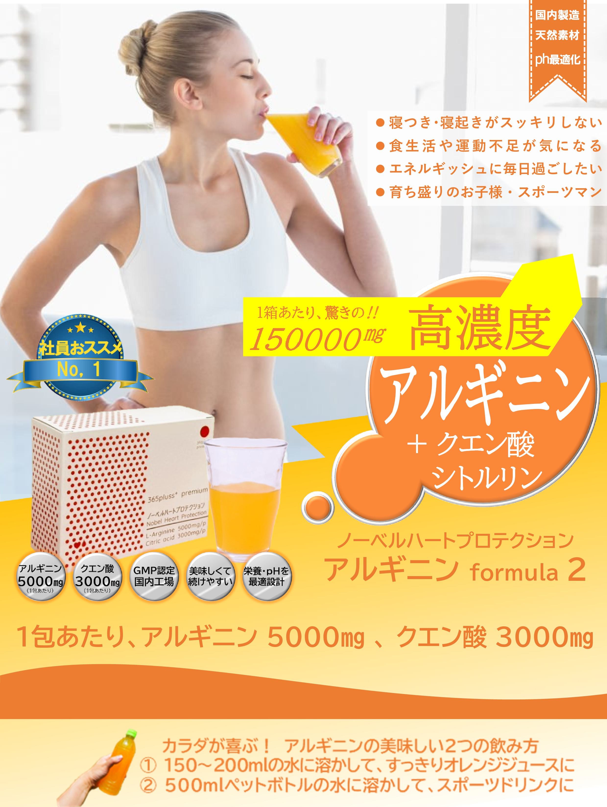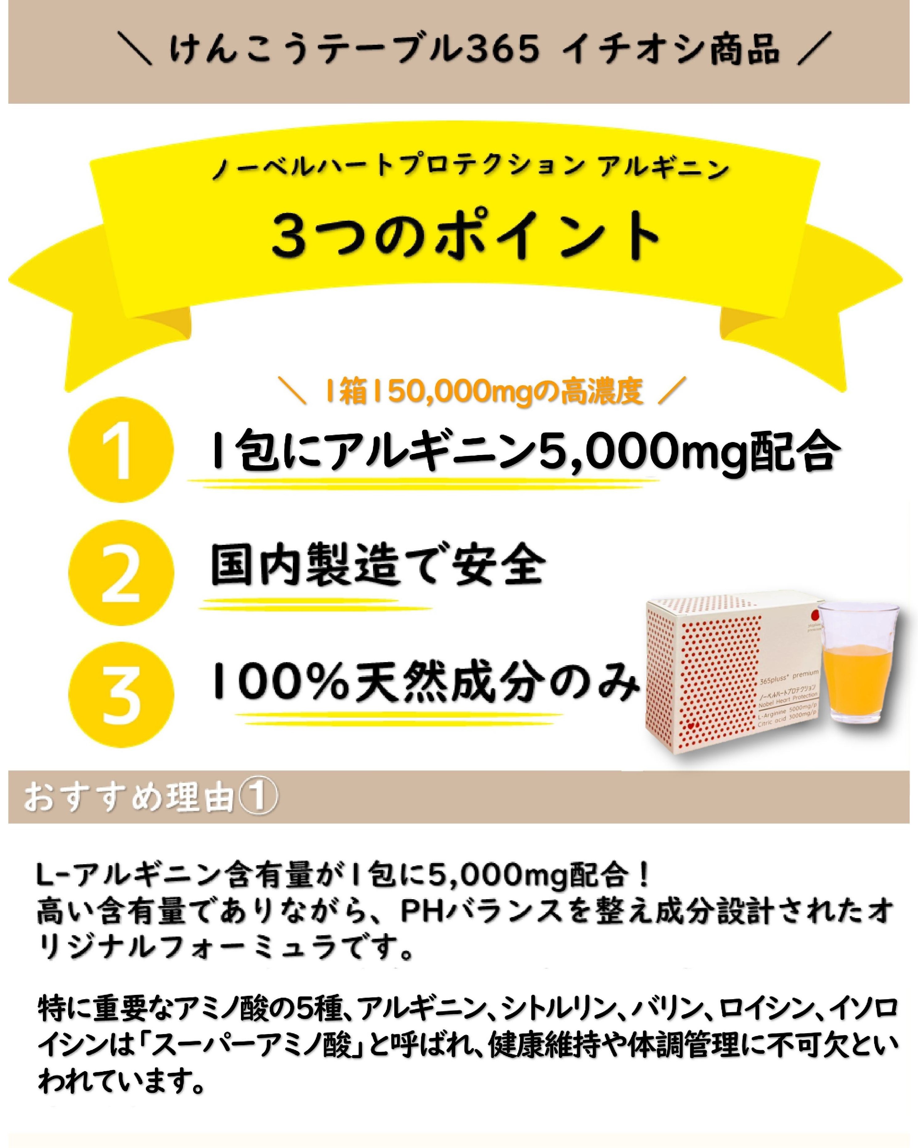 TOP商品一覧 365ドクターズサプリメント ★365プレミアム★_ノーベルハートプロテクション(アルギニン × シトルリン × クエン酸) 価格: ¥11,880 (税込) [ポイント還元 118ポイント〜] 販売期間: 数量: 箱 在庫: 在庫あり 在庫 在庫あり 返品についての詳細はこちら 1包あたり アルギニン5000mg クエン酸3000mg の配合は 国内トップクラス! さらに効果を高める 抗酸化成分など14の成分 L-アルギニン、クエン酸、L-シトルリン、L-カルニチン、亜鉛、葉酸、ビタミンA(β-カロテン)、ビタミンC、ビタミンB6、ビタミンD、ビタミンB12、ビタミンK、D-リボース、二酸化ケイ素 だから体感が違〜うぅ! \\もっとコスパ重視なら// ■こちらの商品も人気です↓↓↓ さらにオトクな「定期コース」はいかがですか? うっかり買い忘れもなく安心です! ■商品概要 商品名 ノーベルハートプロテクション メーカー 株式会社365プラス 内容量 345g(11.5g×30包),1包あたり、L-アルギニン 5,000mg、クエン酸3,000mg、シトルリン500mg含有 原材料 オレンジ果汁粉末(オレンジ濃縮果汁、デキストリン、温州みかん濃縮果汁)、L-シトルリン、還元麦芽糖水飴、L-カルニチン、亜鉛含有酵母、L-アルギニン、クエン酸、グリシン、香料、甘味料(ステビア、ソーマチン)、V.C、微粒二酸化ケイ素、V.B6、葉酸、V.D、V.K、V.B12(一部にオレンジを含む) 賞味期限 枠外右側に記載 ■栄養成分表示 1包(11.5g)あたり エネルギー 43.57kcal たんぱく質 6.69g 脂質 0.08g 炭水化物 4.30g 食塩相当量 0.00g お気に入り お気に入りリストを見る 商品カテゴリ おトクな定期購入(送料無料‼) 【定期便 25%OFF】★365プレミアム★_ノーベルハートプロテクション(アルギニン × シトルリン × クエン酸) 【2ヶ月毎2袋セット 定期購入価格】 けんこうテーブル365 乳酸菌 【2ヶ月毎2箱セット 定期購入価格】 おいしい大豆たんぱくプロテイン 【2ヶ月毎2袋セット 定期購入価格】 けんこうテーブル365 酵素【2ヶ月毎2袋セット 定期購入価格】 薬用ホットタブ重炭酸湯Classic 90錠【2ヶ月毎2袋セット 定期購入価格】 健康女王サプリメントの重炭酸バス 90錠 ★365プレミアム★_ノーベルハートプロテクション(アルギニン × シトルリン × クエン酸)けんこうテーブル365 乳酸菌おいしい大豆たんぱくプロテインけんこうテーブル365 酵素 サプリメント ★365プレミアム★_ノーベルハートプロテクション(アルギニン × シトルリン × クエン酸)けんこうテーブル365 乳酸菌おいしい大豆たんぱくプロテイン けんこうテーブル365 酵素★365プレミアム★_酵素(ナットウキナーゼ × パパイヤ × 多穀麹) 生活用品 薬用ホットタブ重炭酸湯Classic健康女王の重炭酸バスコスモクリーンカード お知らせ 商品パッケージリニューアルのお知らせ配送遅延について